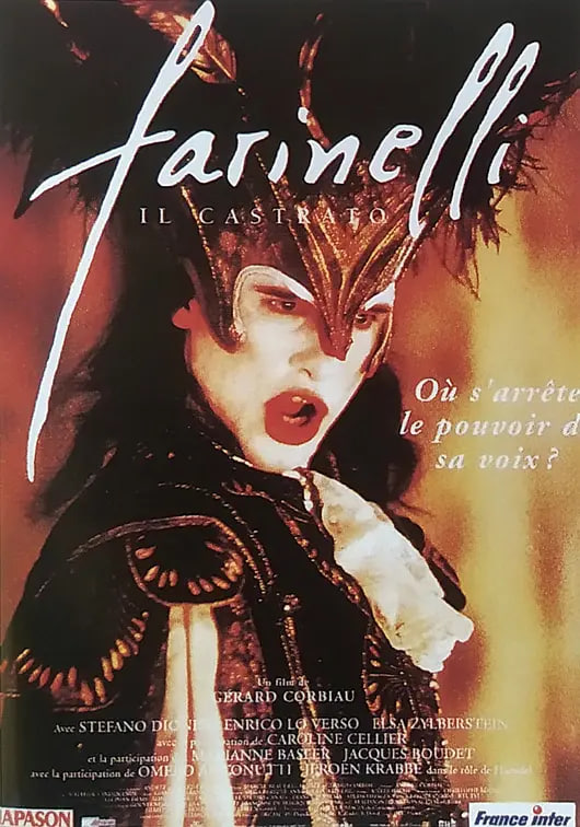 这部电影是由意大利、比利时、法国合拍的,曾获得金球奖最佳外语片,凯撒奖最佳服装设计、最佳音响以及奥斯卡最佳外语片提名。 古典音乐作曲家卡多(恩里克·洛维索 Enrico Lo Verso 饰)为了保全弟弟法瑞内利(斯特法诺·迪奥尼斯 Stefano Dionisi 饰)的声音不会因为成长而消失,不惜在他孩童时实施宫刑,从而让法瑞内利成为了伟大的歌唱家。兄弟两个人的命运就此相连,约定从此共有一切——音乐,荣誉,女人。法瑞内利的醉人的歌声及纯真的魅力迷倒了不少美女,卡多与弟弟分享一具肉体,并在感情和事业上处处控制着单纯的法瑞内利。终于有一天,了解真相的法瑞内利悲痛不已,无法原谅他的兄长对他的所作所为,从此两人决裂。在日食来临的时候,卡多割腕未遂,苏醒的他终于得到法瑞内利的原谅,于是,他在弟弟的女人爱丽丝肚子里留了个孩子作为对以前行为的补偿后悄然离去