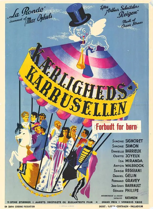 一位无所不知的对话者带领我们经历了1900年维也纳的一系列风流韵事。一名士兵邂逅了一位热情似火的年轻女士。之后,他与一位年轻女士发生了婚外情,这位女士后来成了女佣,并和屋里的男主人做了同样的事。男主人又引诱了一位已婚女子。就这样,在人生的欢愉旋转木马上,不断旋转。
