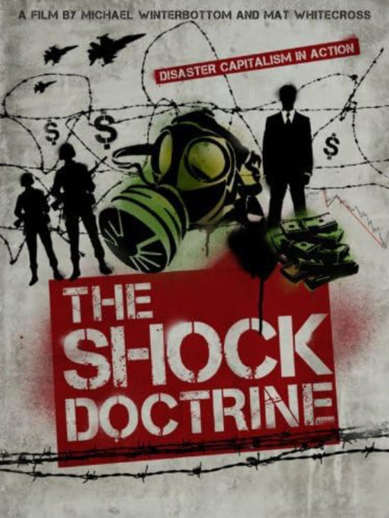 纳奥米·克莱恩在讲座中追溯了各种思想的交汇,即使用休克疗法和其他感官剥夺来改变行为,以及使用米尔顿·弗里德曼和芝加哥学派的“休克疗法”来改变国家经济。她按时间顺序展开:皮诺切特的智利、阿根廷及其军政府、叶利钦的俄罗斯、布什和布雷默的伊拉克。捏造的反派分散了注意力或为之辩解:马克思主义、福克兰群岛、核武器、恐怖分子;以及金钱和权力从多数人向少数人的巨大转移。新闻镜头、解说员和名嘴支持了克莱恩的分析。她以充满希望的语气结束了演讲。