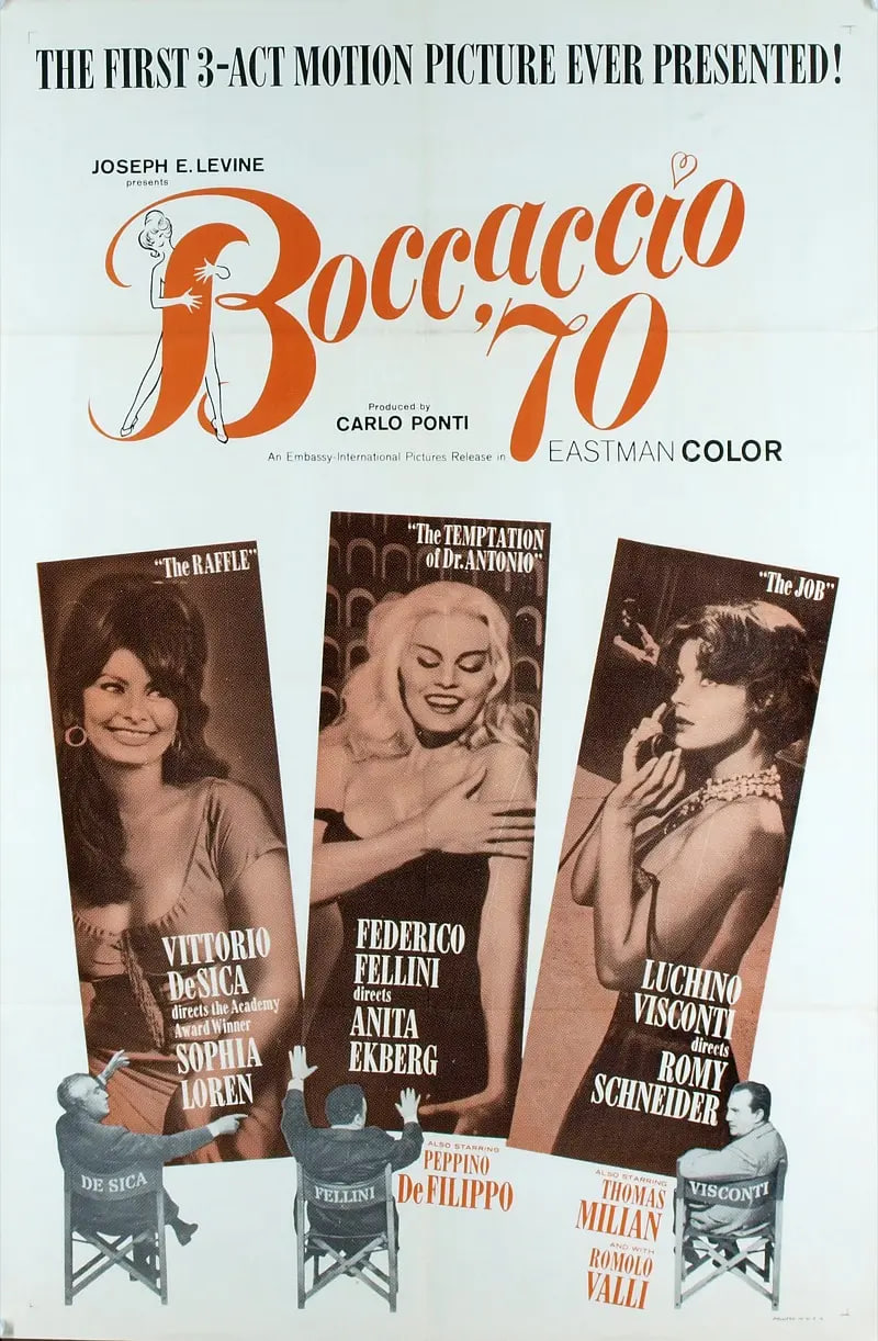 维斯康提那段讲罗密·施奈德扮演的美丽少妇设计向丈夫报仇,冒充他情妇,让他花钱才能得到她;德西卡的那段讲一个胆小的人赢得一个奖,奖品是跟一个女孩的约会;莫尼切里那段在很多海外版本中均被删除,其风格比较偏传统喜剧,较低调,容易消失在同行的阴影里;但最为出彩的还是费里尼的那段,名为《安东尼博士的诱惑》,讲一个波霸美女从海报上“活”过来,取笑一个道貌岸然的禁欲男子。 幕后制作: 四位重量级意大利导演用各自的手法捕捉薄伽丘的精神,以罗马为舞台呈现大型世像图。虽然只是部短片,但费里尼却以轻松嘲讽但不失沉重的语气来讲述这个揭露上层阶级虚伪道德观的故事。安东尼博士是个值得探讨的人物,他面对价值崩溃、道德沦丧感到无能为力,妄图以虚伪的面具来掩盖自己内心的欲望,但当巨大的女郎形象从广告中走出与他同乐时,他的本性终于显露。费里尼用梦幻与现实交错的手法同时制造出荒诞与沉重两种调子,极具表现力,在本片中给人印象最为深刻。