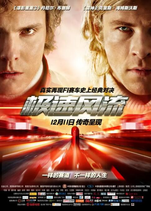 一直以来,尼基(丹尼尔·布鲁赫 Daniel Brühl 饰)和詹姆斯(克里斯·海姆斯沃斯 Chris Hemsworth 饰)都是针锋相对的死对头。尼基认真严肃,对赛车的职业十分尊重,詹姆斯喜欢铤而走险,将赛车作为自己寻花问柳的筹码,虽然两人有着截然不同的个性,但他们之间的较量却从未停止过。   为了改变自己不够成熟的性格,詹姆斯和偶然遇见的名模苏西(奥利维亚·王尔德 Olivia Wilde 饰)结婚了,尼基亦找到了自己的一生挚爱并且加入了法拉利车队,而此时生活已经走上了下坡路的詹姆斯则加入了麦克拉伦车队,一对冤家再次站在了人生的战场之上。一次比赛中,天降大雨,尼基出了车祸身受重伤,詹姆斯因此夺得了冠军。可是,尼基并没有因此而放弃,在极短的时间内,尽管受到了众人的制止,但他依然毅然地回到了赛场上。